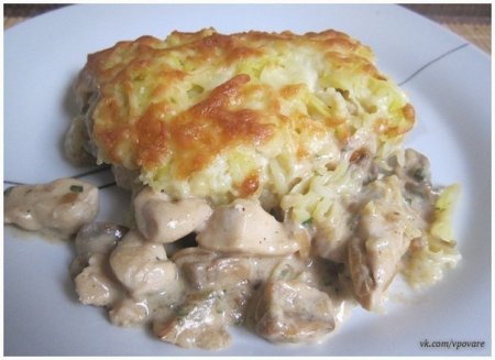 Ингредиенты: - 300 гр куриной грудинки (2 шт) - 250 гр грибов (в идеале шампиньоны) - 3-4 средних картофелины - 1 луковица - 1 ст. ложка муки - 250 мл молока - 150 гр сливок (любой жирности, все зависит от желания разожраться) - 100 гр тёртого сыра (сыра лучше не жалеть) - соль, перец, зелень по желанию - растительное масло для жарки