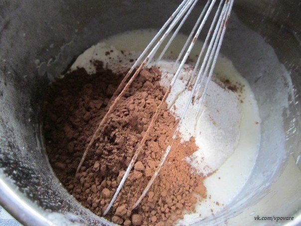 2.Добавляем просеянную муку, соду и какао. Ещё раз хорошо взбиваем.