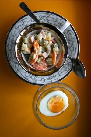 Ингредиенты 4 порции Колбаса вареная 250 г Картофель 3 штуки Морковь 1 штука Огурцы соленые 2 штуки Яйцо куриное 3 штуки Зеленый горошек консервированный ½ стакана Соль по вкусу Майонез по вкусу
