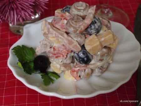Ингредиенты: Копченый окорочок — 1 шт. (400–500 г) Сыр — 200 г Помидор — 2 шт. Шампиньоны (маленькие) – 300 г Маслины – 1 банка Майонез, соль, перец — по вкусу