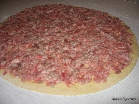Раскатываем тесто, на него выкладываем фарш