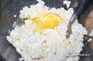 2. Перемешать творог и яйцо. Добавить банан, сахар, муку. Все равномерно перемешать. Никакой жидкости НЕ добавлять.